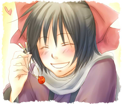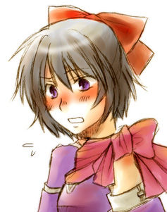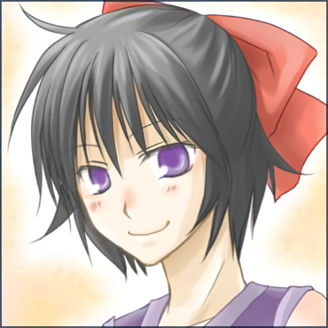 黒い髪、紫の瞳。はね気味ボブヘアをハーフアップにし、赤い大きなリボンでまとめている。つり目。
