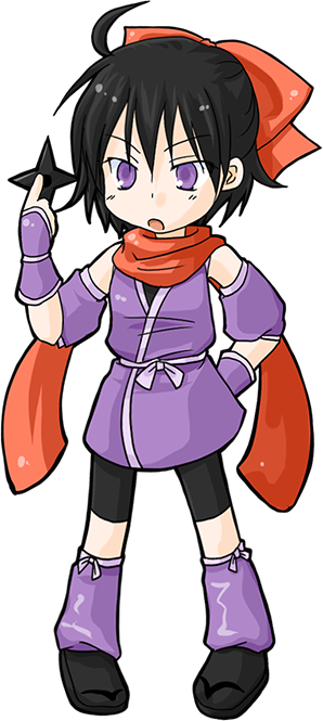 肩の出た丸袖の忍び装束、紫の篭手。装束の下はスパッツを着用。普段から丈が短く動きやすい格好をしている。