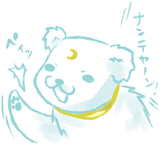 額に三日月型の石が埋め込まれた白い小熊。コロコロとした体形。黄色い首輪も額の月と同じ石。