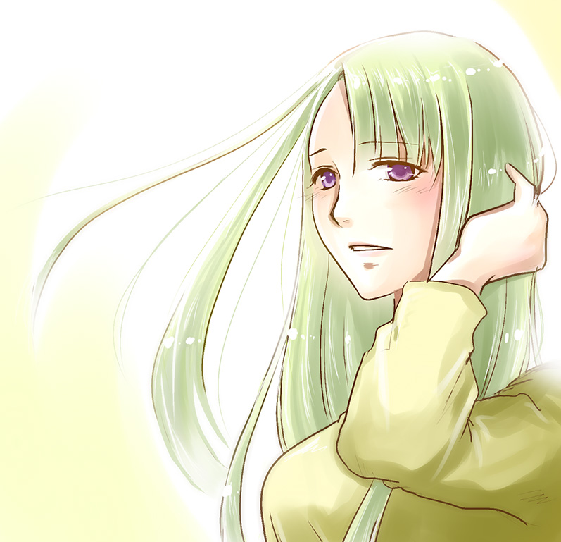 銀に近い薄緑の髪、紫色の瞳。サラサラストレートなロングヘア。ややタレ目。化粧っ気がなく地味な印象。