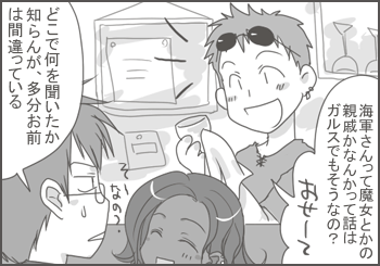 - 店の前で行き倒れている所を保護し、食事を振る舞った。それから積極的にアタックされているので流石に好意を持たれている事はわかるが、どちらかというと餌付けみたいな事しちゃったかだとか、あるいは単純に懐かれているのか等と思っているため、恋愛的な意味とは思っていない。店の常連客のジャスカルと仲がいいと感じている。