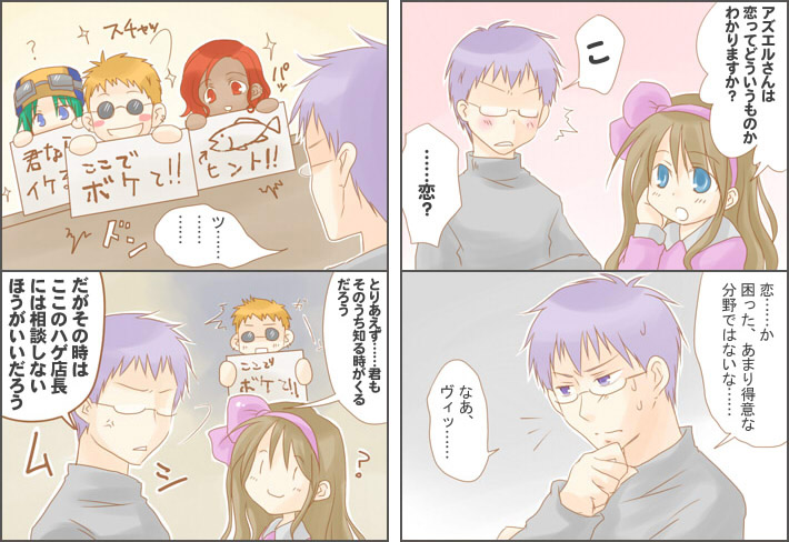 - 昔から付き合いがあり、アズと呼んでいる。アズエルの方が年上のためやや兄のように振る舞い、ヴィッツは手のかかるデカい弟のように思われている。性格はヴィッツとは真逆の生真面目なタイプで、やや冷たく見られがちだが昔から優しい人間である事をヴィッツは知っているため、気の置けない間柄となっている。現在アズエルはガルス働いているため、休暇が取れた時のみしか会えないが、手紙などのやり取りはしている。帰郷の際の土産をいつも期待している。