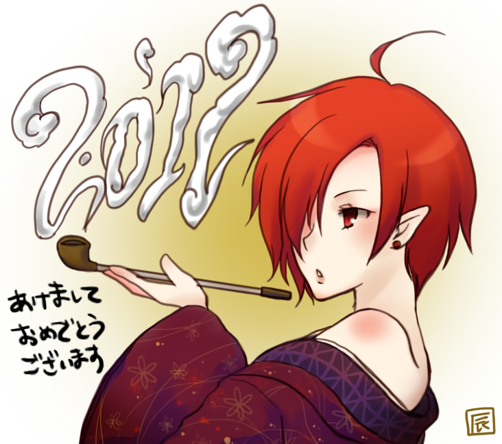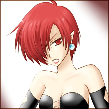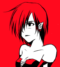 人の姿では、真っ赤な髪と赤い瞳。右目だけ隠れる分け方のショートヘア。背中に大きな傷跡がある。尖った耳に青いイヤリング。