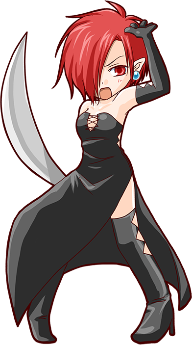巨大シミター、ボンテージワンピース、ロングスカート、ハイヒール、イヤリング。
