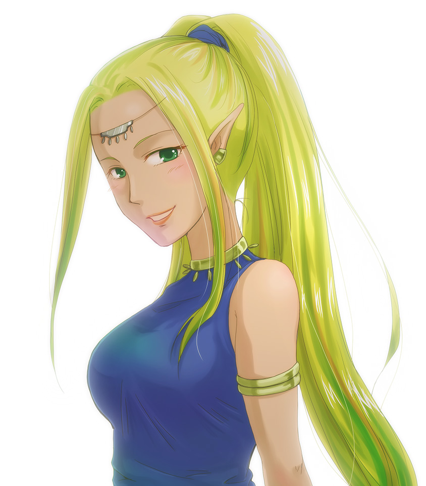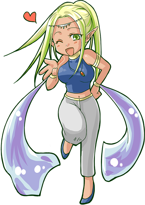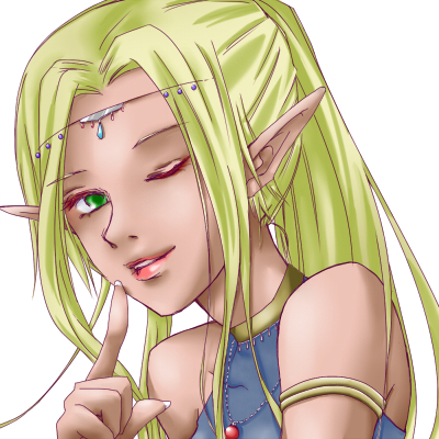 金髪、翠の瞳。長い髪をアップに束ね、緑色のメッシュをいれている。褐色の肌。赤色を基調とした強めのメイク。エルフ特有の尖った耳と整った顔立ち。非常にスタイルが良くグラマーな体型。