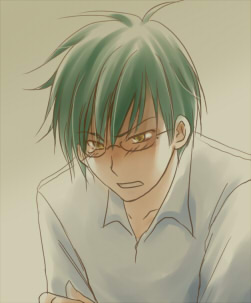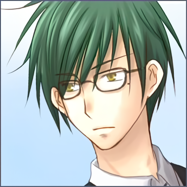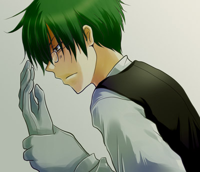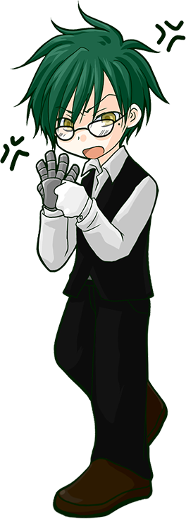 深緑の髪、金色の瞳。左分け長めショート。ウェイター服。