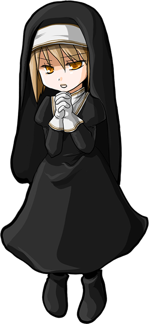 サイドが長めのボブ。修道服と修道女ヴェールで露出が極力少ない格好。