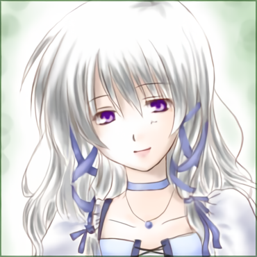 銀の髪、菫色の瞳。柔らかいウェーブのロングヘア。両サイドを紺色のリボンでまとめている。柔らかく穏やかな表情で、気持ちが顔に出やすく赤くなりやすい。服装は通常はドレス。