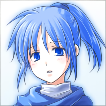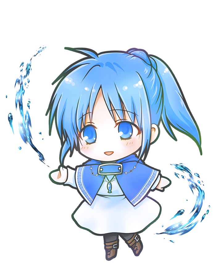 青いショート丈のマント、白いワンピース、ブーツ。魚型のペンダントに銀色のブレスレットを装備。