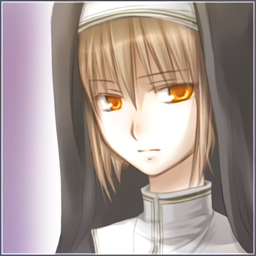 薄茶の髪、オレンジの瞳。切れ長の目で硬い表情。 サイドが長めのボブ。修道服と修道女ヴェールで露出が極力少ない格好。